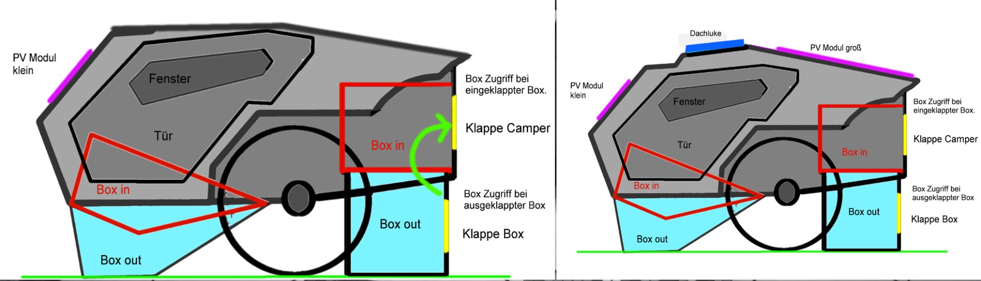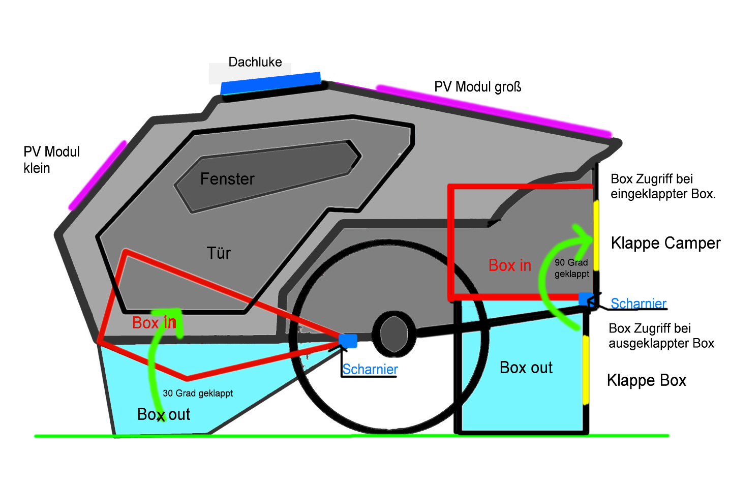 Die Box unter dem Camper, welche im parkenden Zustand herabgelassen wird, muss bei mir auch nicht so groß sein. Sie dient zwar als Stauraum, jedoch werde ich diesen auch in einer zweiten Box im hinteren Bereich des Trailers schaffen. Vieles, was ich draußen nutze, will ich auch von außen leicht zugänglich haben. Tisch, Sitzgelegenheit, Kochutensilien, Tarp, Proviant u.s.w sollen dort ihren Platz finden. Die große Tür benötigt zu dem 2 Schlösser, um anständig zu schließen, diese will ich nicht immer beim Einkaufen öffnen müssen, nur um den Proviant zu verstauen. Hier ist mir ein separater Stauraum lieber, welcher von außen zugänglich ist. Die absenkbare vordere Box muss aber auch dem Chassis geschuldet kleiner ausfallen.