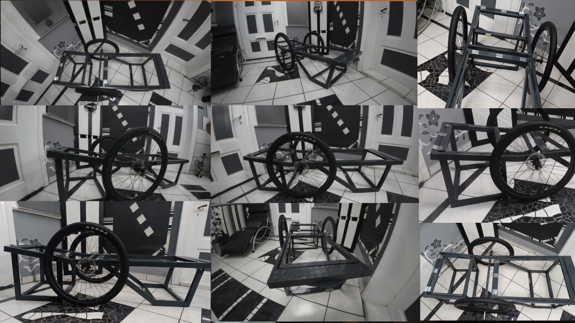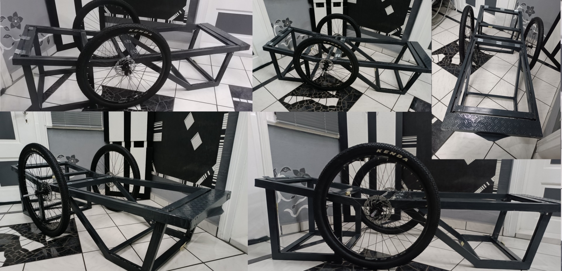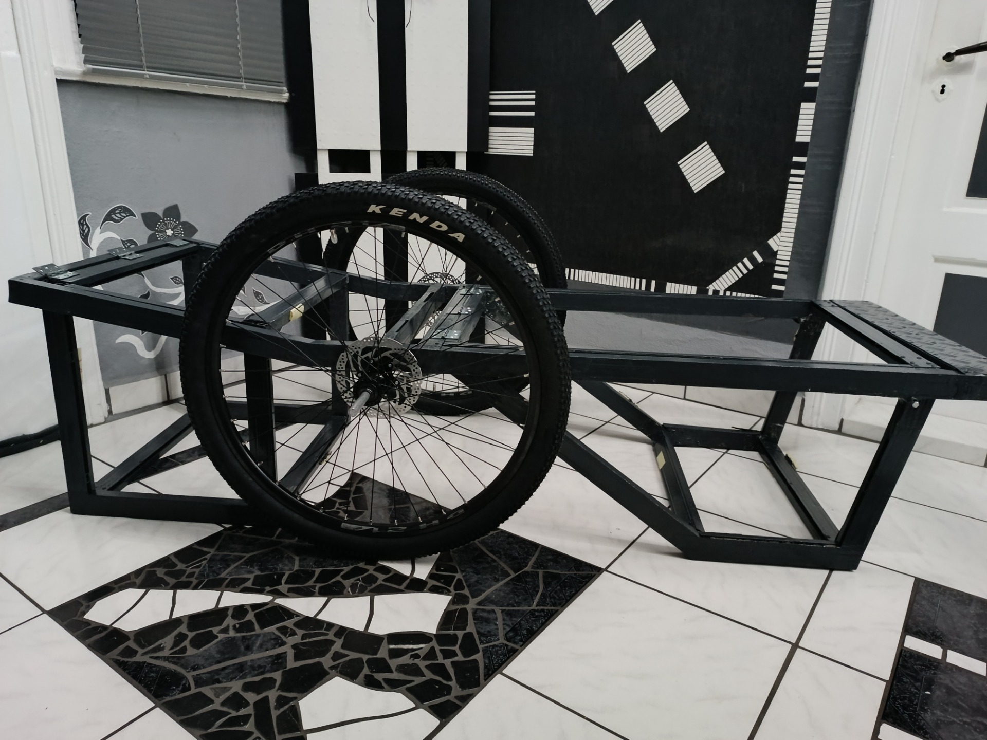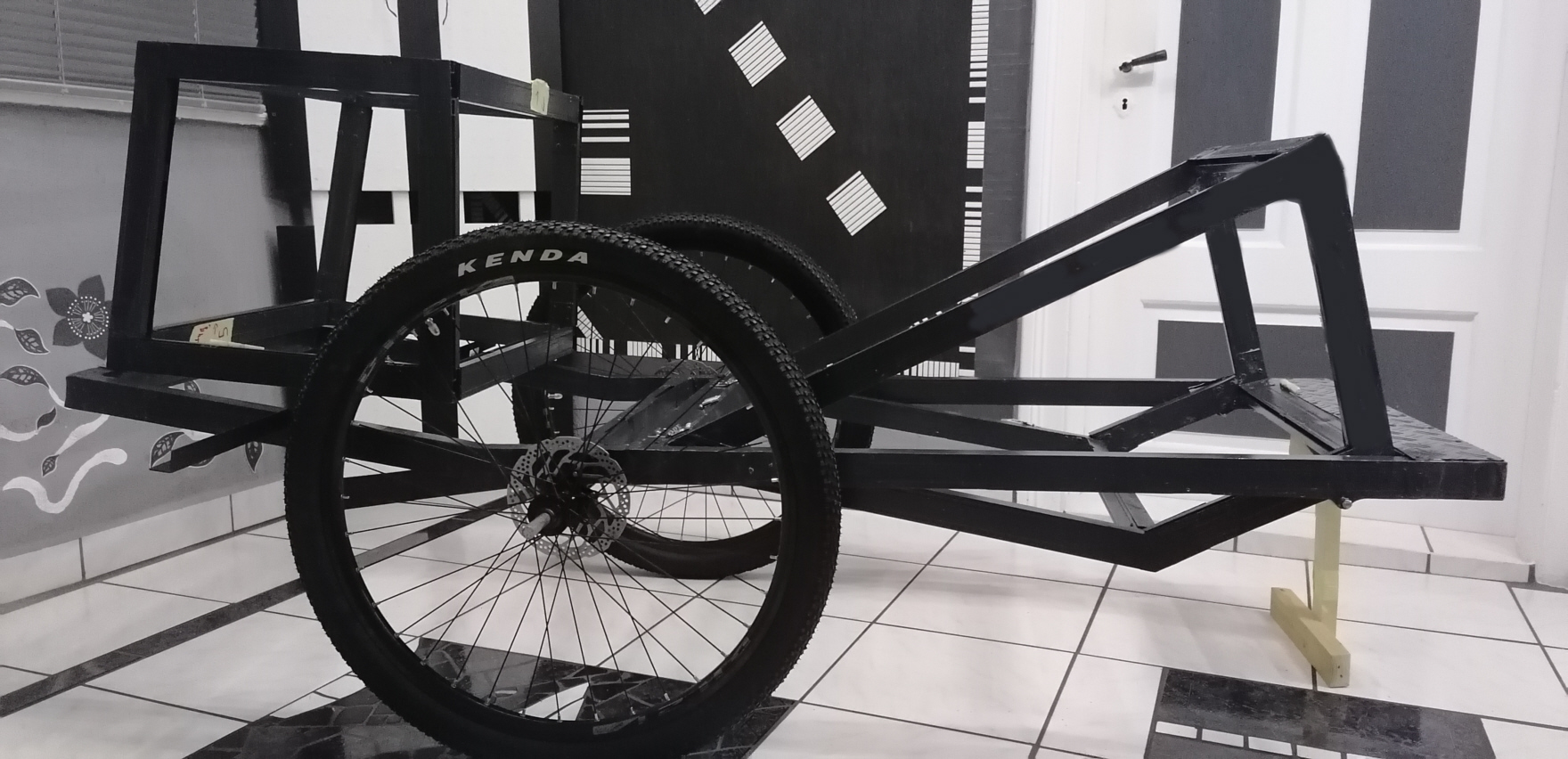 Die vordere Box benötige ich somit nur, um im sitzender Position meine Füße unterbringen zu können. Zudem dient sie natürlich auch als Parkstütze, ebenso wie die hintere Box. Die kleinere Box vorn wird vermutlich auch nicht allein den abgestellten Trailer tragen können. Das Original hat 26 Zoll Fat-Bike Bereifung, ich verwende 28 Zoll Normalbereifung. Vom Gesamtdurchmesser her, nimmt sich das nicht viel und ich habe die Möglichkeit, bei Bedarf die Bereifung mit dem Hinterrad meines Trike zu rotieren.