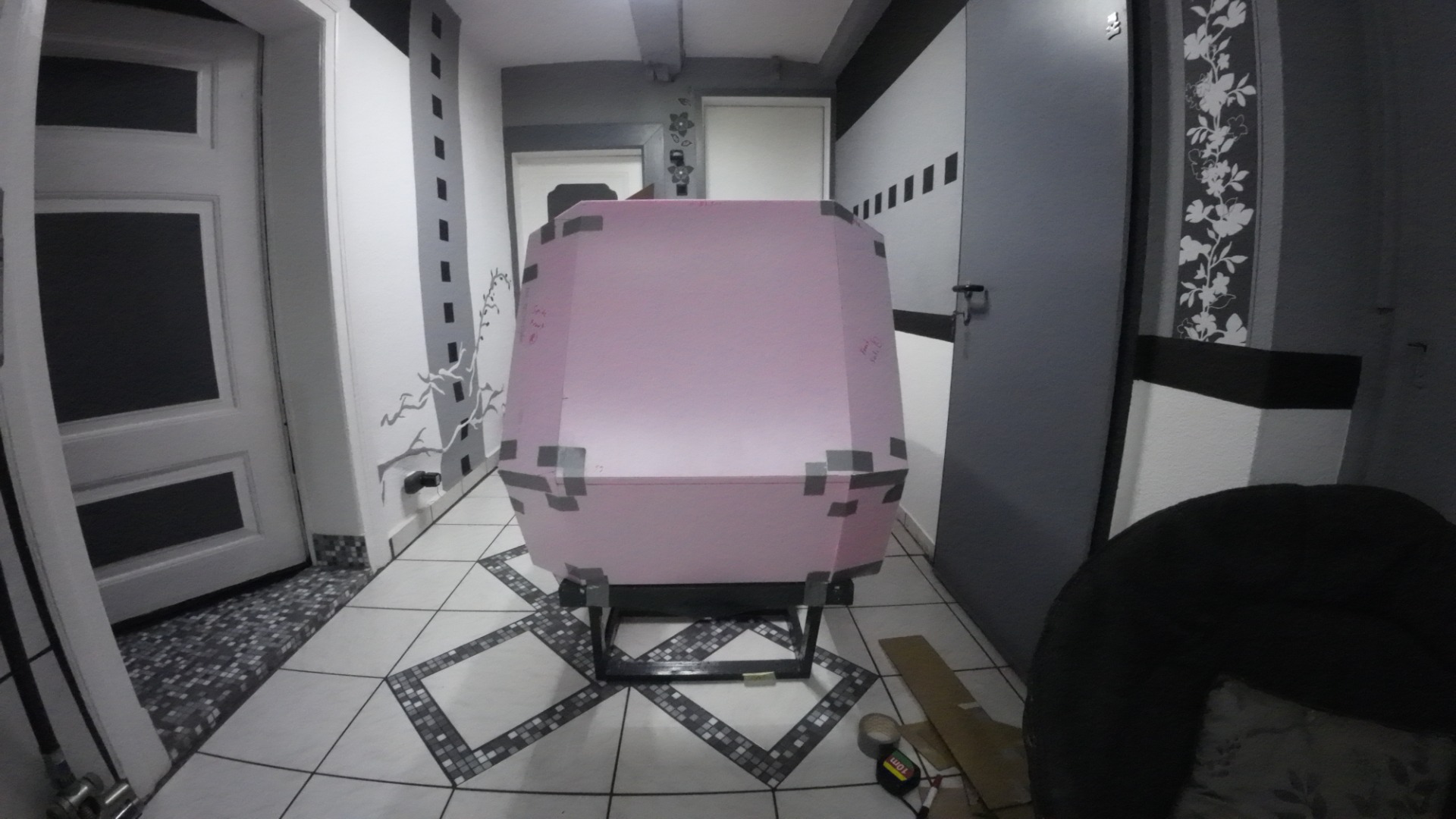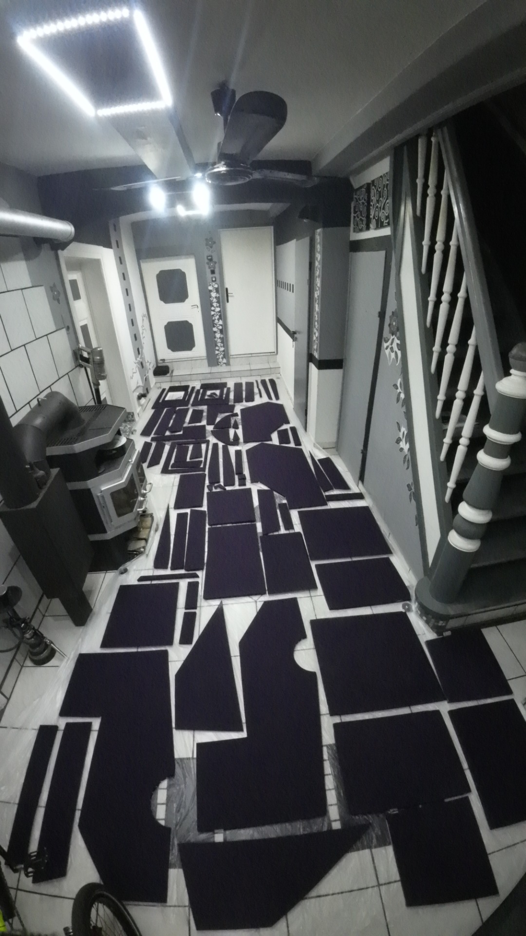 Auch wenn die Bilder mit der Action-Cam durch den Weitwinkel leicht verzerrt sind, sind sie glaube ich immer noch besser, als die vom Handy. Mein Flur ist einfach zu eng, die Werkstatt noch enger, dort kann ich nur noch die Platten zuschneiden.