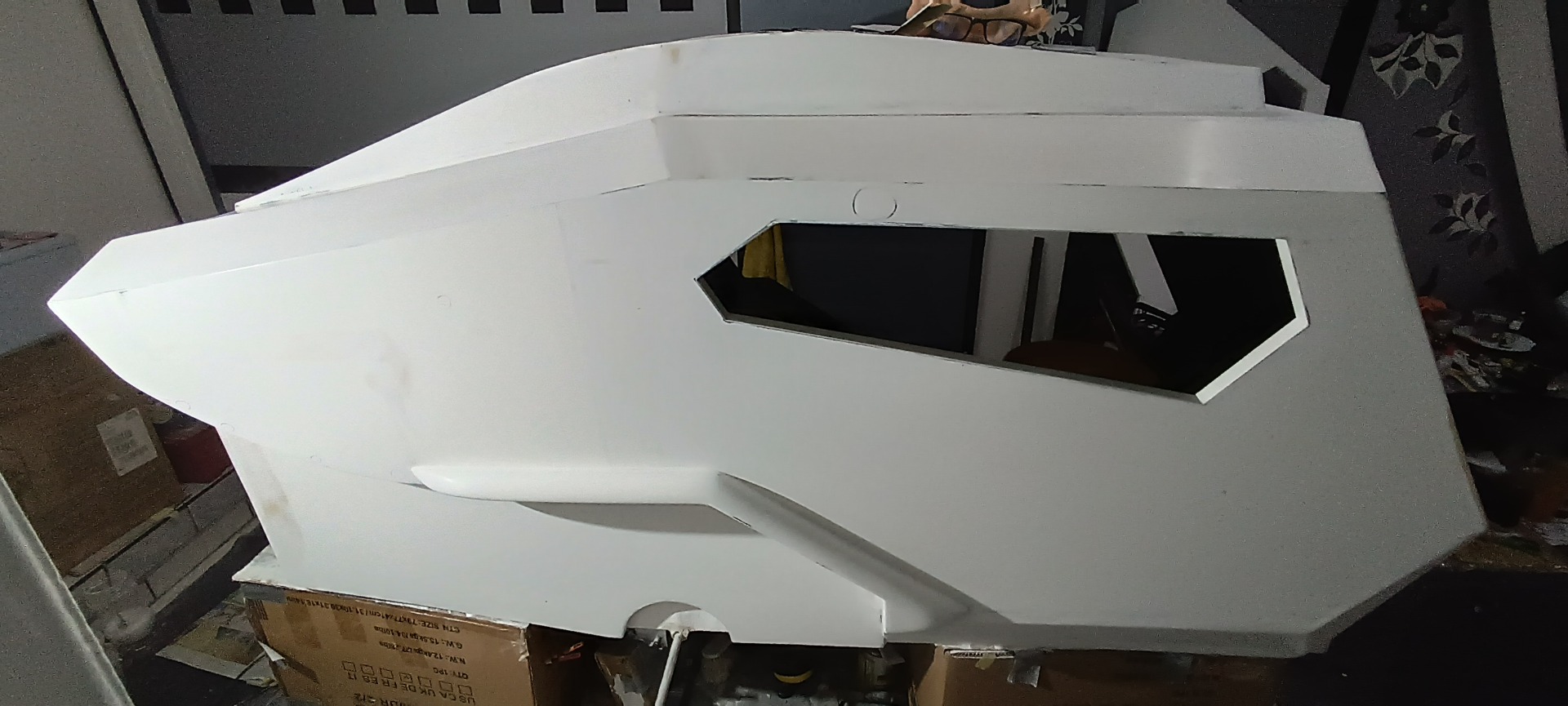 Der untere Teil der Karosse ist so weit zugeschnitten, auch die Luke der hinteren Box, welche den Zugang im ausgeklappten Zustand ermöglicht, ist ebenfalls zugeschnitten und teilweise verklebt.